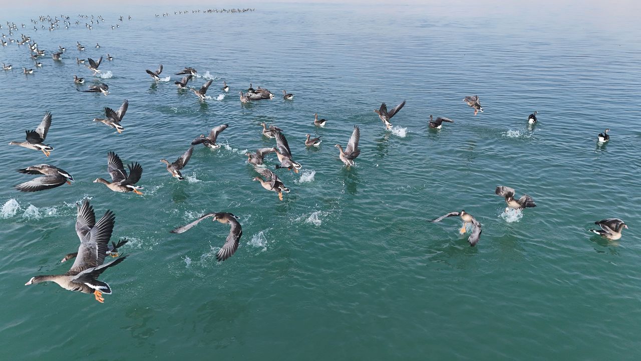 Van’ın önemli sulak alanlarından Erçek Gölü, göç yolculuğundaki küçük sakarca kazlarına ev sahipliği yapıyor. Dron ile havadan görüntülenen yüzlerce zarif kuş, gölde görsel şölen oluşturdu.
