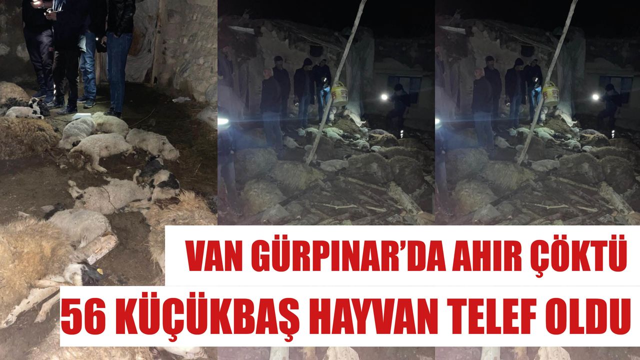 Van’ın Gürpınar ilçesinde bir ahırın çökmesi sonucu 56 küçükbaş hayvan telef olurken, 1 inek yaralı olarak enkaz altından kurtarıldı.