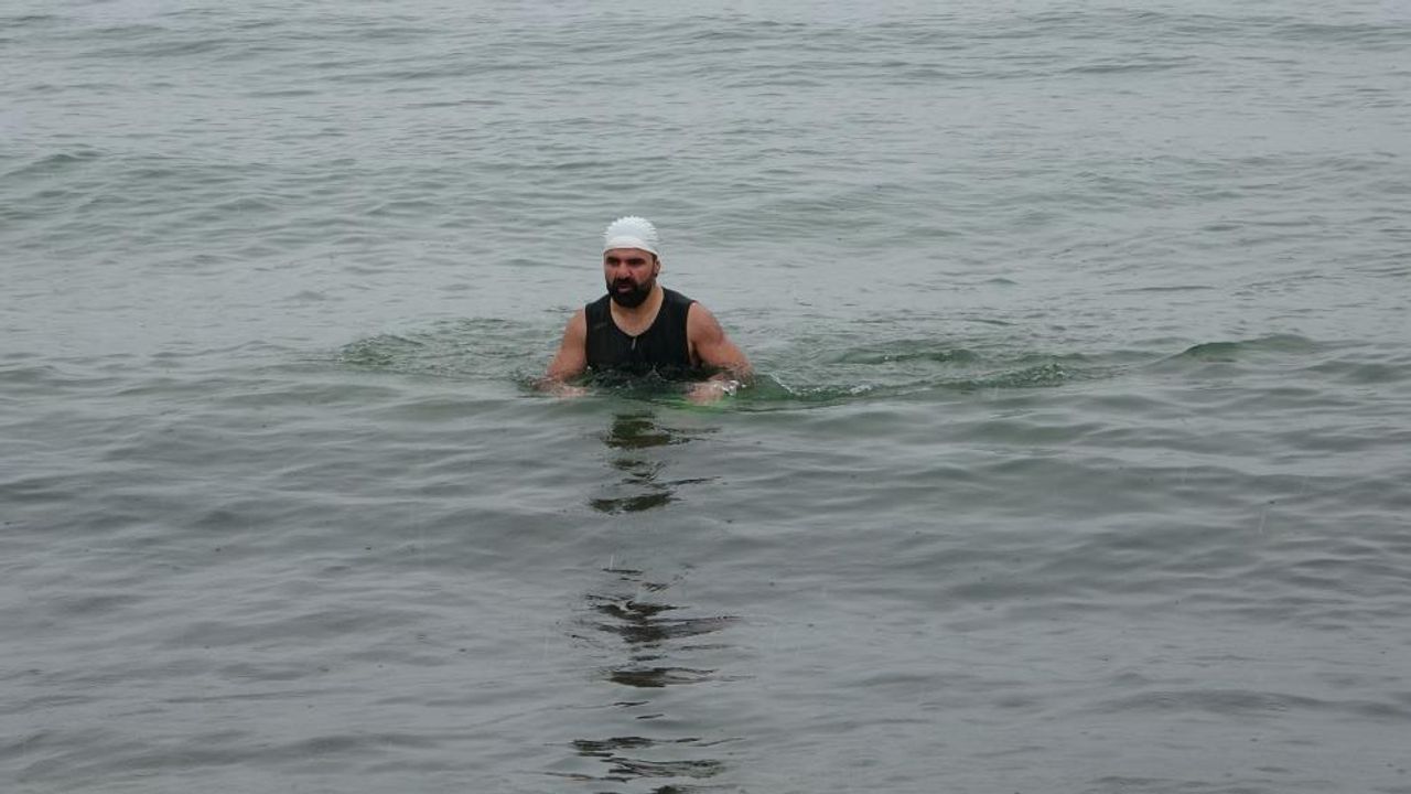 Sıfırın altındaki hava sıcaklığına rağmen sabah saatlerinde göl kıyısına gelen Türken, kısa bir hazırlığın ardından dalgalı ve soğuk suya girerek yüzmeye başladı.